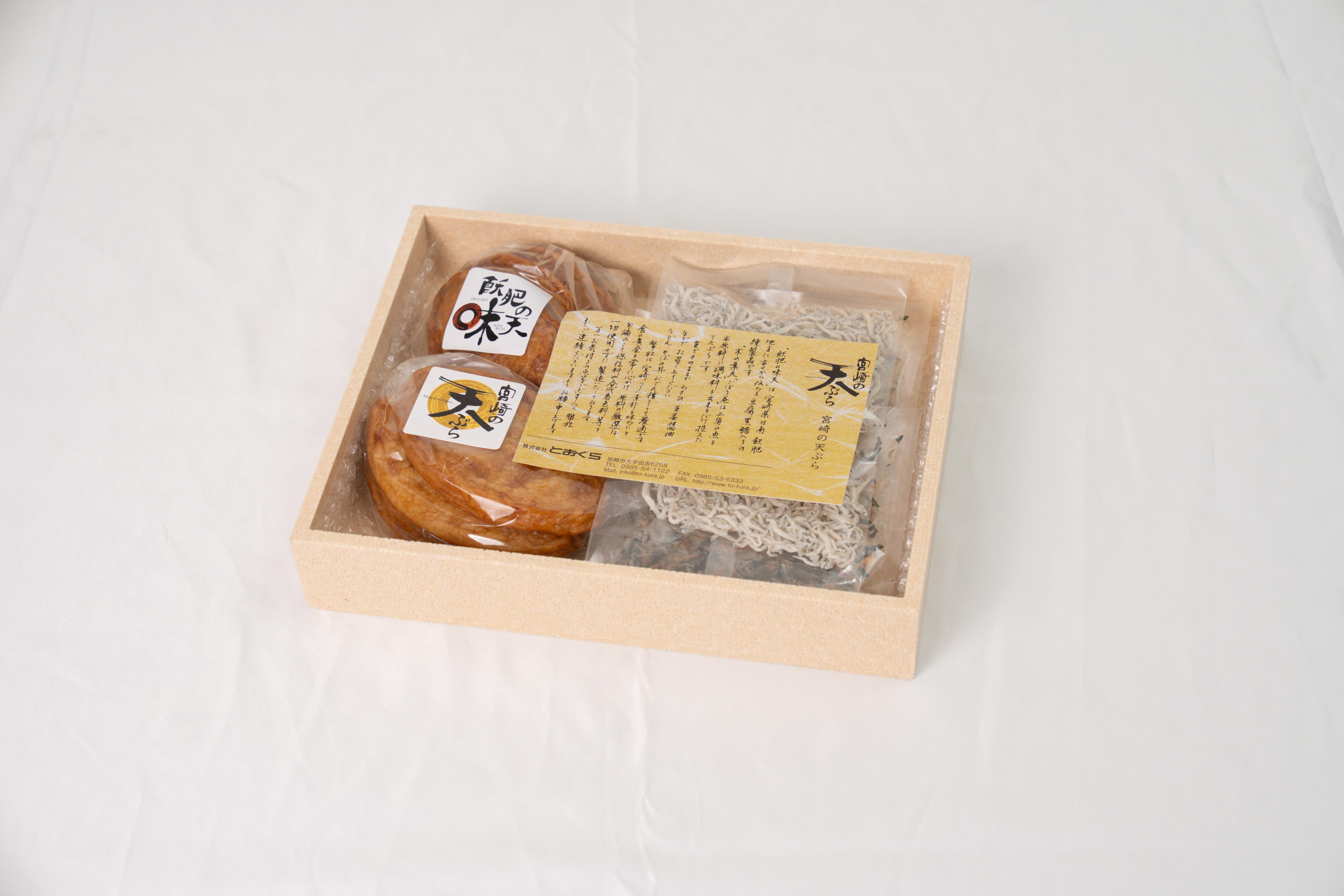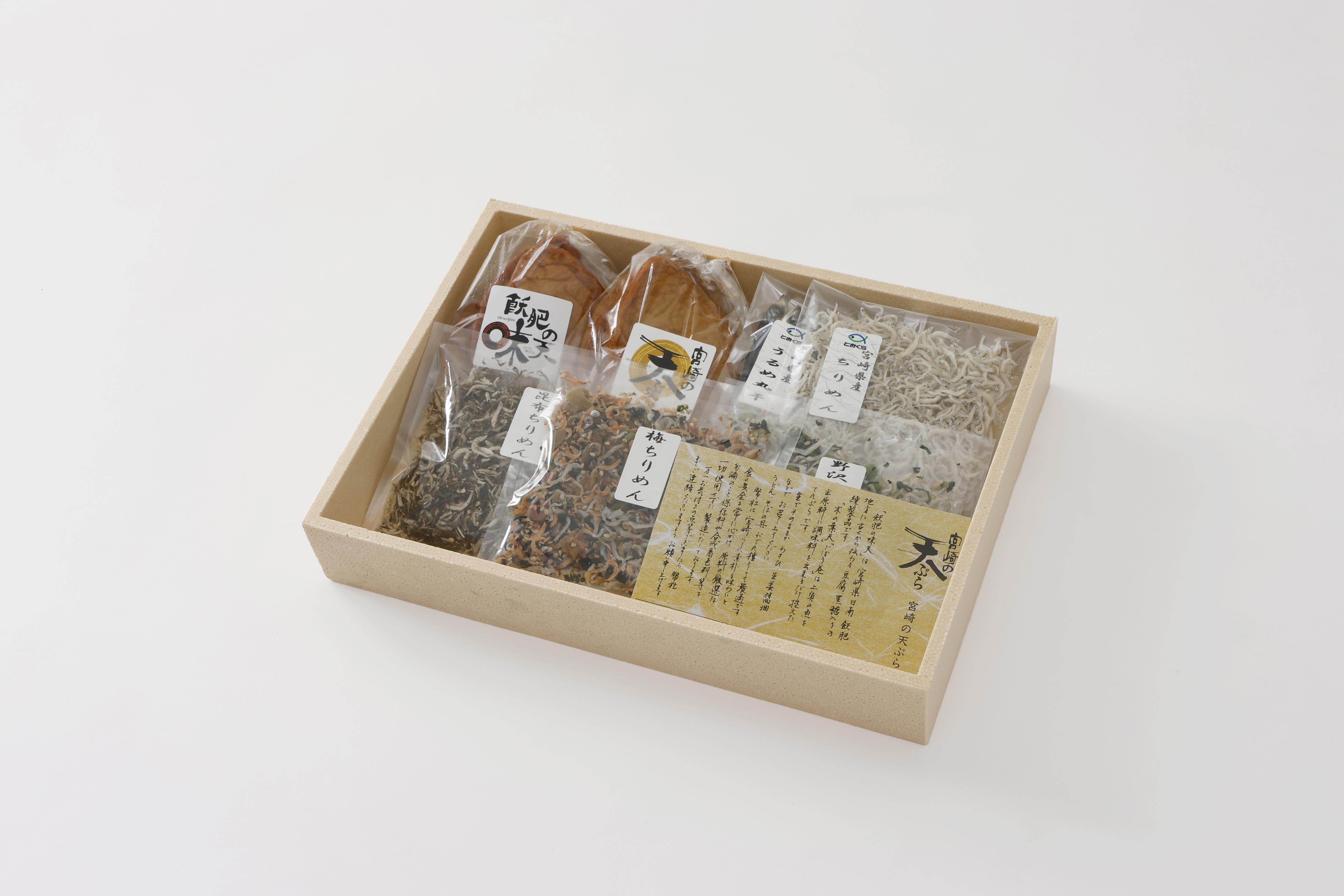 | 内容量 | 7種類(飫肥の味天3枚入り・てんぷら3枚入り・ちりめん50g1袋・梅ちりめん30g1袋・昆布ちりめん30g1袋・野沢菜ちりめん30g1袋・うるめ丸干し50g1袋) |